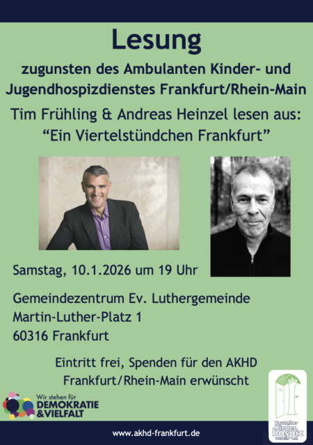 Die Lesung findet zugunsten des Ambulanten Kinder- und Jugendhospizdienstes Frankfurt / Rhein-Main statt.